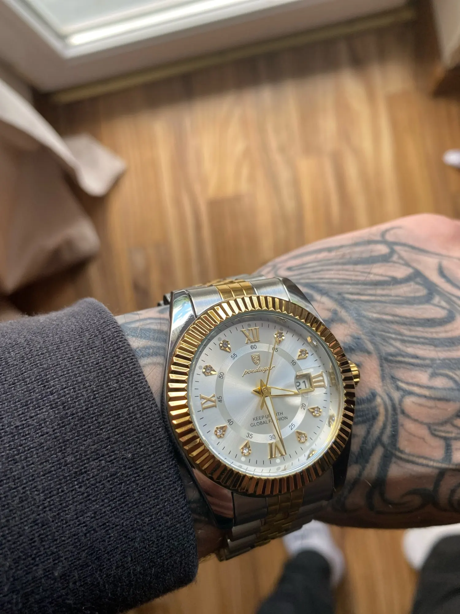 Stainless Steel Strap – Polished two-tone design for comfort and long-lasting wear.